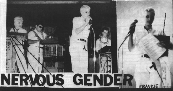 CLUB 88 WEEKEND: June 1-EDDIE & THE SUBTITLES/NERVOUS GENDER/PLUGZ June 2-EDDIE & THE SUBTITLES/MIDDLE CLASS/X by Al Eddie and the Subtitles played both nights of this sold out weekend. It was so packed that thay wouldn't let anyone else in (you know, fire laws). If you went out you had to wait till someone else left to get in, you know, like the Starwood. Anyway Eddie played and were actually quite good. With a name like that, you don't know what to expect. If was sort of typical rock but it was good old rock and roll and no one was disappointed. Nervous Gender (who opened on Friday) were a real suprise. Devo meet the Screamers-and they beat both those bands (especially the Screamers) at their own game. Three familiar faces on synthesizers and Frankie the lead singer (but they all sang, Gerard was best) and the audience was held captive (literally). Great future for these guys (and girl). I don't want to talk about the Plugz anymore cause I always rave (no exception tonight), only weird thing was when Barry jumped up and hit his head on the ceiling and fell down and broke his bass strings. Oh well. Next night Eddie and the Subtitles again, again good. Middle class finally go on to the drunken, sweating audience. Since I haven't seen them in months, it was a special event. And they were fuckin' great. Fast still, and tighter and sounding better. The encore was the Crass classic "Do they owe us a living, course they fuckin' do!" It was good, but not great, cause Jeff had to fake the words. The pogo maniacs reminded me of the Masque daze, just perfect. X finished up the night and finished off the audience, Yeah. Xene deserves our cover. |
